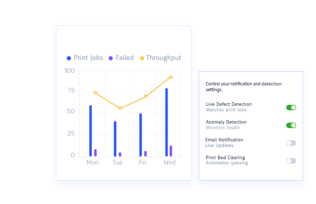 3D Printers will result in failed prints due to issues like: spaghetti, stringing, layer shift, bed adhesion, clogging, and more. These failures occur due to a variety of factors that are difficult to control. It is important to detect these issues as soon as they happen in order to save material, time, and energy.